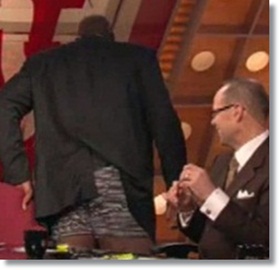 Apparently, the only thing left to ask is does the big man wear boxers or briefs. Shaq, always the entertainer, does more than just answer the question, as he proudly models, dances a jig, then kisses everyone on the forehead, before spanking one of the producers. Guess Shaq is enjoying the whole TV personality thing?