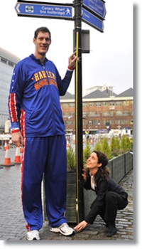 More recently, the famed Harlem Globetrotters stumbled onto another superhuman-sized hoops sensation in the form of 24 year old, 7‘8 British big man Paul “Tiny” Sturgess, who is a native of Loughborough, England.