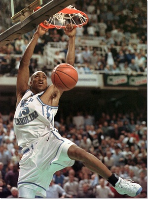 Check out this rare video of Vince bending the rim when at the University of North Carolina and later in the video dunking on future Hall-of-Famer Tim Duncan…