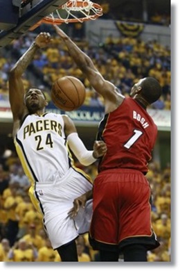 But it was George, that made the biggest waves Saturday evening as he had perhaps the signature play of the night, finishing off a thunderous facial dunk on the underachieving Chris Bosh at the rim that had the flashbulbs popping, as he used a tremendous all around effort(28 points, 8 rebounds, 5 assists, and 3 steals) to help force a Game 7 back in Miami on Monday.