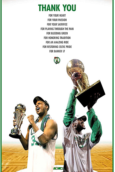 “Thank you for your heart,” the ad reads. “For your passion. For your sacrifice. For playing through the pain. For bleeding green. For honoring tradition. For an amazing ride. For restoring Celtic pride.”