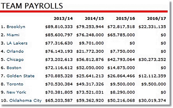 In fact, their starting line-up, consisting of Deron Williams ($18.5), Joe Johnson ($21.5), Paul Pierce ($15.3), Kevin Garnett ($12.4), and Brook Lopez ($14.7) makes an astronomical $82.4 million alone, a figure more than every other NBA team salary outside of the Miami Heat for ’13-’14.