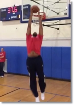 As one could imagine, the 39 year old Wallace accepted the challenge and barely pulled off a reverse jam in comical fashion while the 21 year old Mitchell nearly tore the rim off with a vicious windmill…